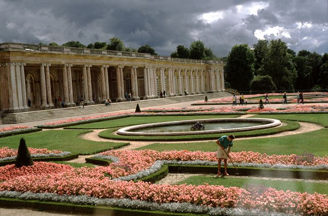 Das Schloss Versailles ist eine der größten Palastanlagen Europas und war von der Mitte des 17. Jahrhunderts bis zum Ausbruch der Französischen Revolution die Residenz der Könige von Frankreich.Grand Trianon, ein Lustschloss im weitläufigen Park von Versailles. 1687/88 von Jules Hardouin-Mansart (1646-1708) errichtet, als privater Rückzugsort für König Ludwig XIV. Hier zog er sich gerne mit seiner Favoritin Madame de Maintenon zurück. Es ist ein mehrflügeliger Bau nördlich des Großen Kanals. In der Mitte das Peristyl, eine Säulenhalle, die den linken mit dem rechten Trianonflügel verbindet. Im Sommer wurde dieser Bereich unter Ludwig XIV. manchmal als Speisesaal genutzt. Im 19. Jahrhundert hatte man hier unglücklicherweise Glastüren eingebaut, die aber nicht mehr vorhanden sind. Ursprünglich befanden sich auf dem flachen Dach Statuen und Vasen, die allerdings in der französischen Revolution geplündert wurden.
