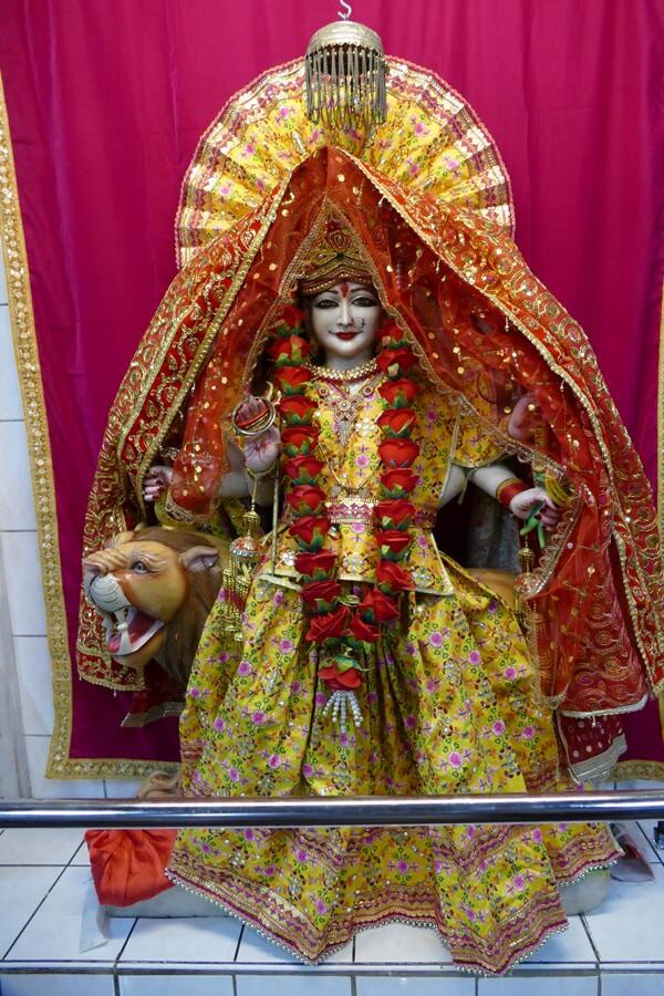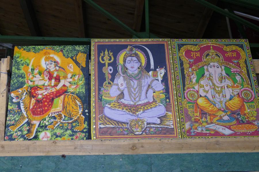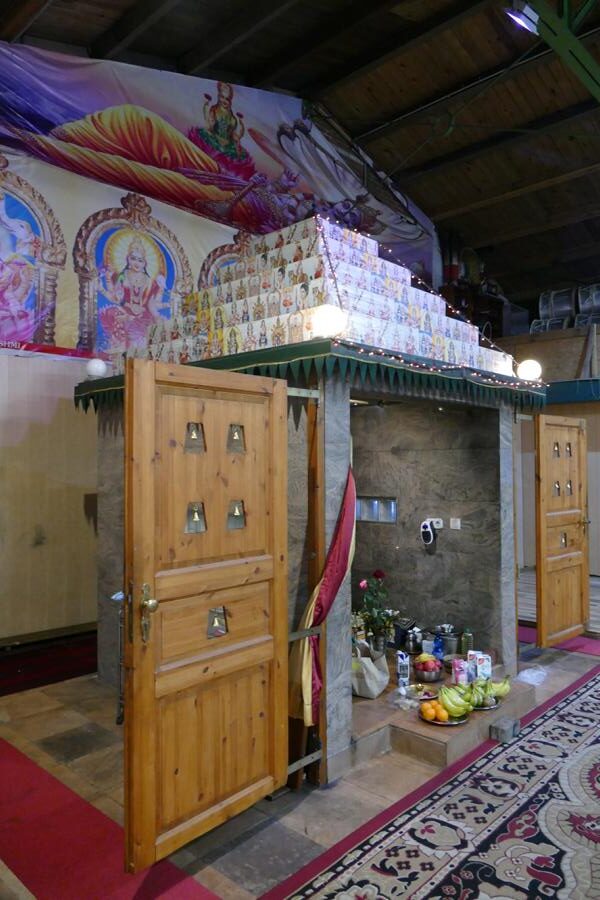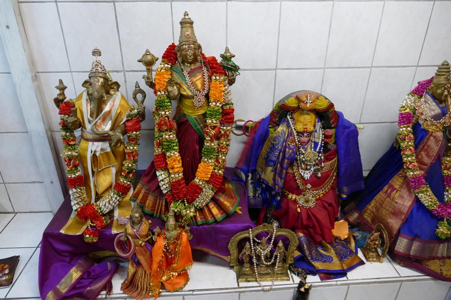 Innere der ehemaligen Freiluftturnhalle. Links an der Wand zahlreiche reich gekleidete und verzierte Götterstatuen. Hinten über dem Altar Abbildungen der verschiedenen Götter.